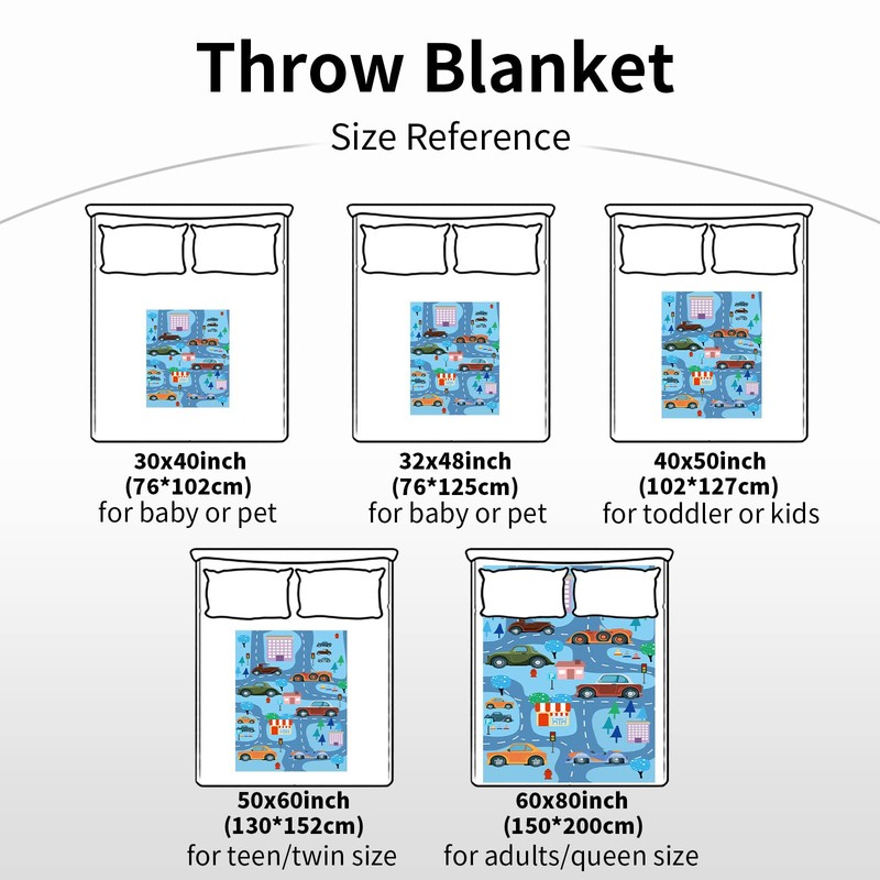 - Throw Blanket Size: The throw blanket have 4 sizes: 60"x80" (150x200cm), 50"x60" (130x152cm), 40"x50" (102x127cm), 32"x48" (72x125cm) and 30"x40" (72x102cm). You can choose the right size according to different needs. 60"x80" is suitable as a blanket on a Queen Size bed. 50"x60" is suitable as a blanket on a Twin Size bed. 30"x40", 32"x48" and 40"x50" can all be used as children's blanket or pets' blanket.