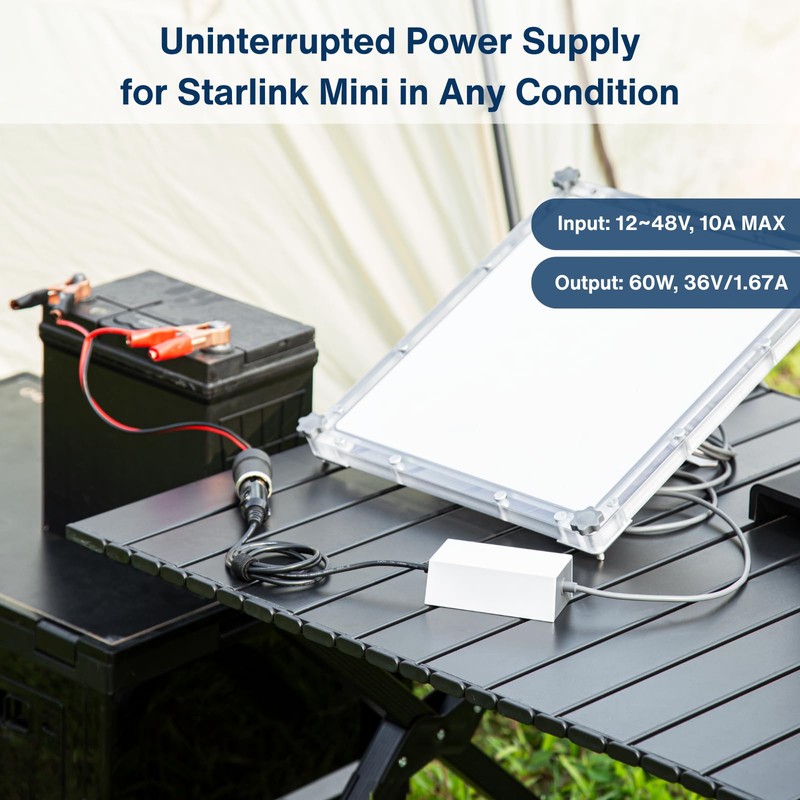 - Reliable Battery Input: 12 V–48 V, Max 60 W Output: Using alligator clips, draw power directly from vehicle batteries (12 V–48 V DC, max 10 A input), internally boosted to a regulated 36 V / 1.67 A (60 W) output—perfectly suited for Starlink Mini operation.
