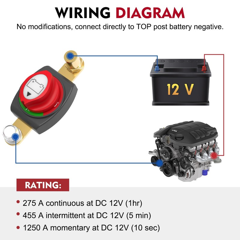- Easy Installation:The top post design and battery terminals simplify installation—no extra cables or connectors needed. Just connect the marine battery switch directly to the battery, with multiple installation options to suit different needs.