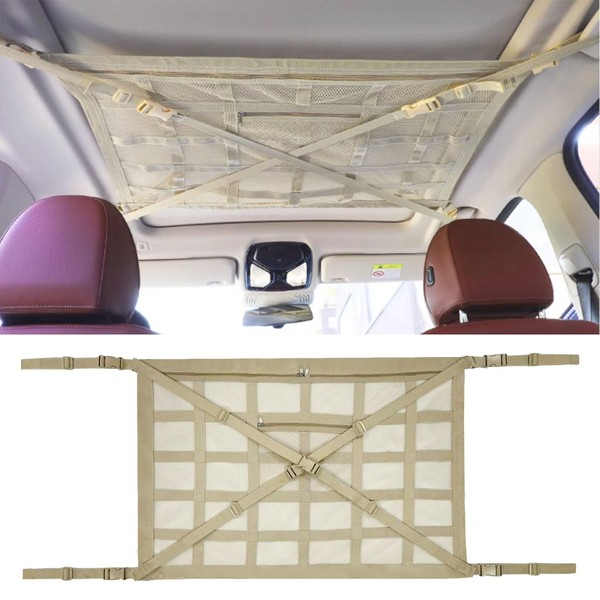 - 【UPGRADED CAR CEILING CARGO NET】The upgraded version of the car ceiling cargo net has added 4 secure reinforced straps to make your cargo more secure. By the design, we added X load bands to effectively prevent cargo from sagging and falling down. Ensures driving safety without obstructing rear view mirror. Double net fabric with additional pocket and zipper design on both ends. It is easier and convenient to store your luggage