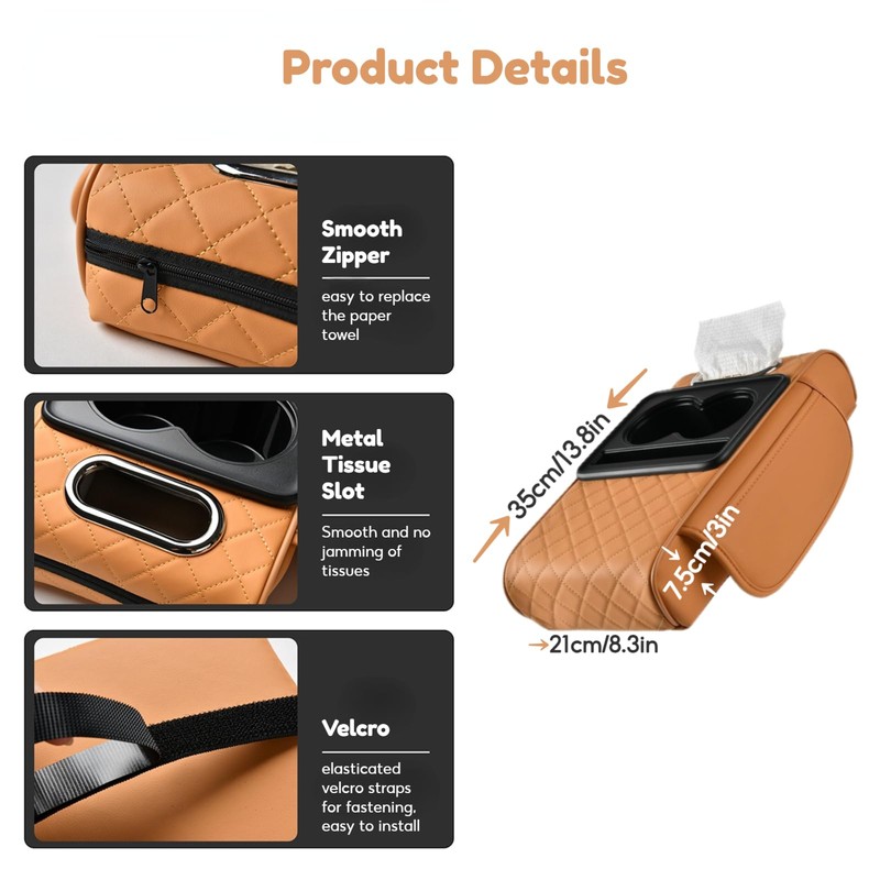 • 🚗【Easy to Clean & Maintain】The waterproof leather surface and polymer cup holders make it easy to wipe away spills or stains. The metal tissue slot ensures smooth tissue dispensing without hassle