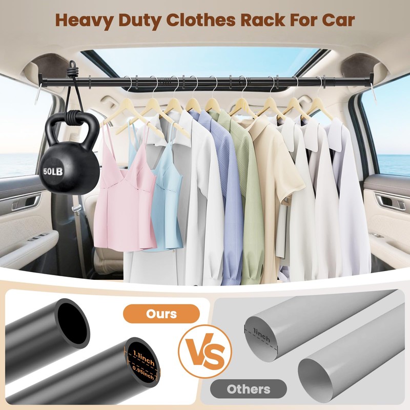 - HEAVY-DUTY LOAD CAPACITY: Constructed with robust three-section iron pipe for superior strength, this car clothes hanger bar securely holds 50 lbs heavy clothing loads without bending. The durable design prevents damage and ensures reliable use during travel or daily commutes. Perfect as a high-performance clothes rod for car and essential car hanging accessories