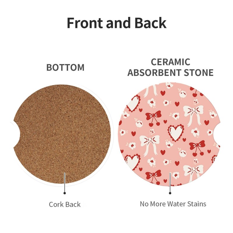 Car Coasters for Cup Red Bows Heart, Absorbent Ceramic Cork Base Drink Coasters with Finger Notch Auto Accessories 2.56" 2 PCS