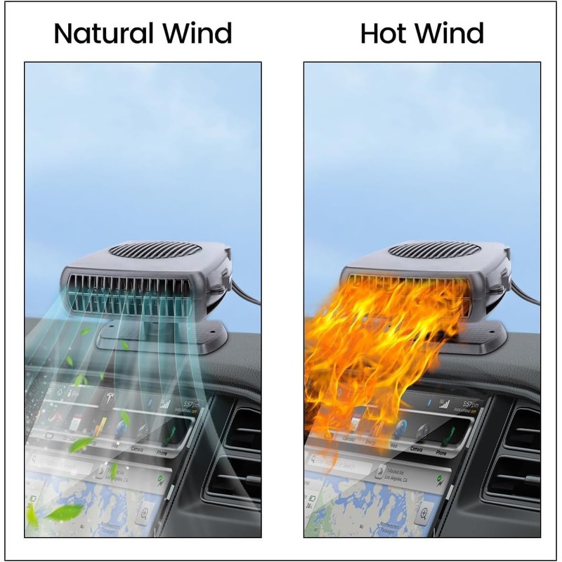 - 【2 IN 1 Modes Portable Car Heater】Car Heater Available all yearWith hot and cold switch. Adjustable wind mode, can be used as cold wind and warm wind. Just change the switch, and the hot or cold air will come out immediately according to your needs. This car heater is not only very suitable for defrosting/defogging car windows and windshields. It can also be used as a cooling fan.