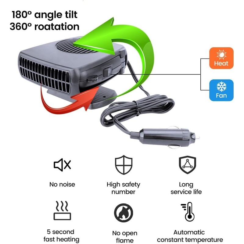 - 【High Quality】 Portable car heater adopts ABS material, high heat conversion, no open fire, safe and instant heating. Cigarette lighter plug is built with fuse for safety use, providing auto power off protection.