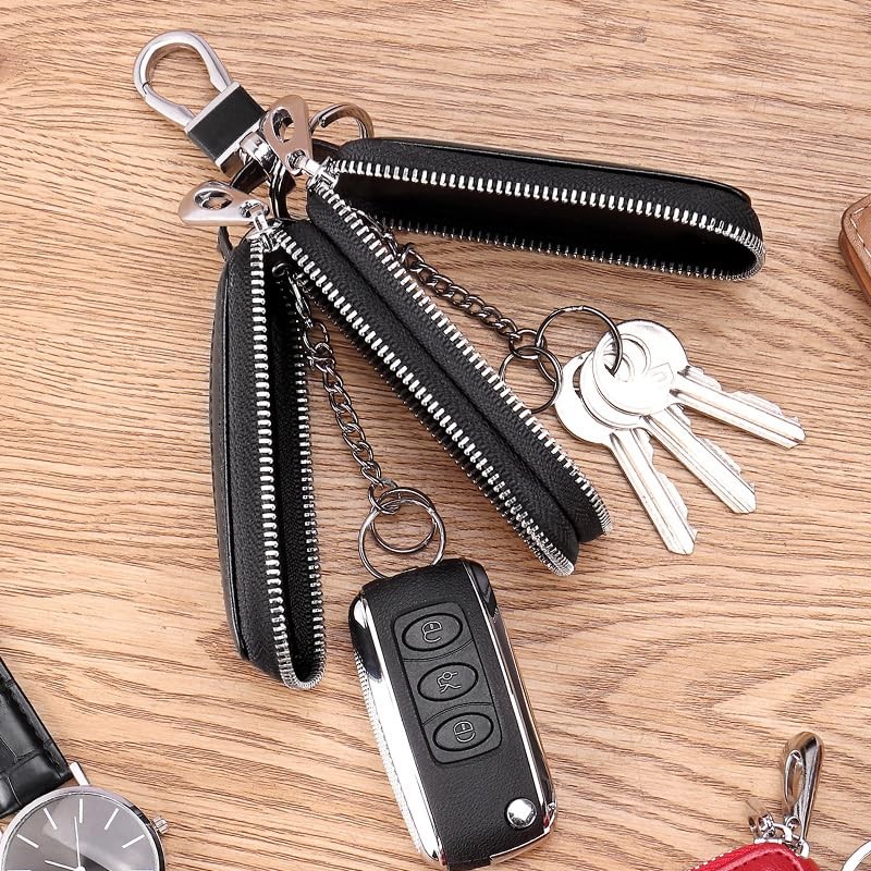 Car Key Chain Bag Double Zipper Leather Protection Key Coin Holder Keyring with Transparent Window