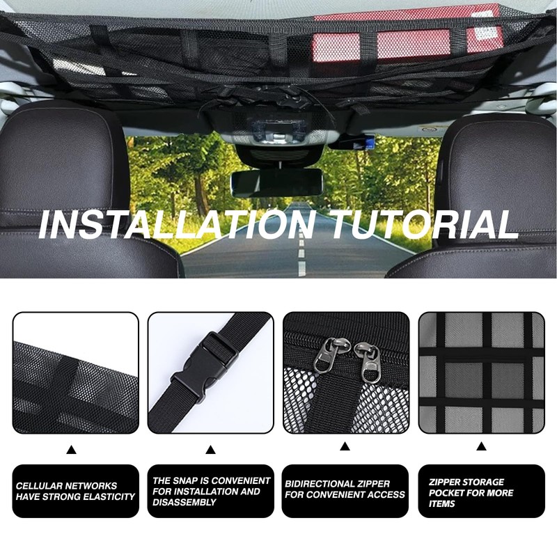 - Car organiser: the packaging contains a luggage net car as well as two adjustable cross straps. These straps help to fix items better, provide strong grip and prevent sagging without covering the rear view mirror - for safe driving. The double layer mesh design ensures that you can find items quickly and store flexibly