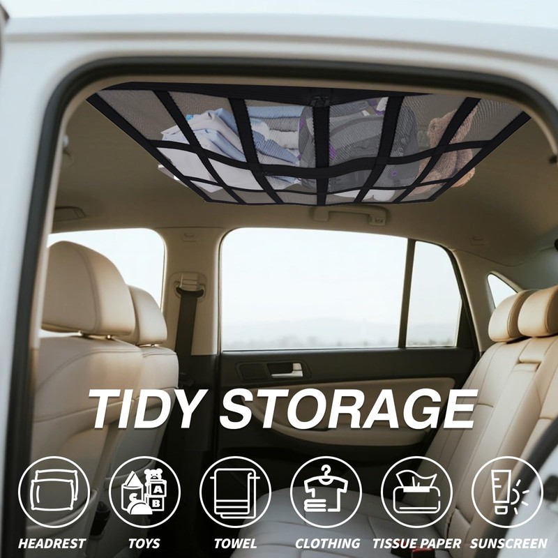 - Space-saving: with a size of 90 x 65 cm, this car organiser is perfect for storing clothes, cuddly toys, handkerchiefs and other lightweight items. Especially convenient for long trips and camping trips. The car luggage net optimally uses the roof area of the interior and thus creates more space on seats and floor - for a tidy vehicle interior