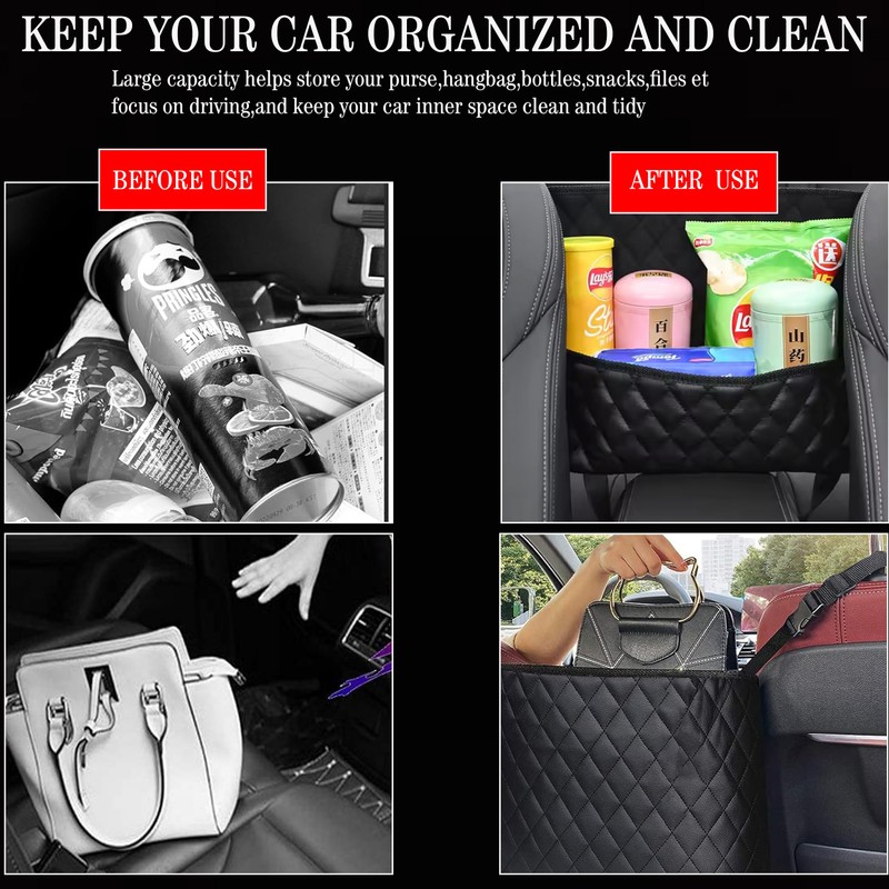 - Multifunctional Car Net Pocket Handbag: Creates extra storage between front seats for items like your handbag, tablet, phone, umbrella, water bottle, and more. Keeps essentials organized, accessible, and your car clutter-free.