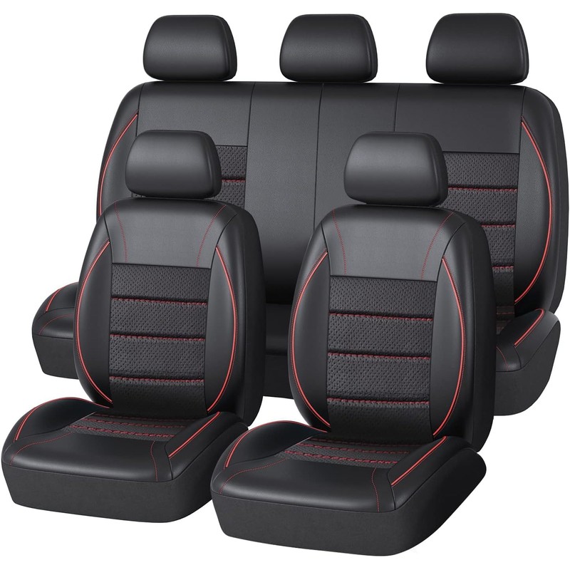 CAR PASS Universal FIT Piping Leather Car Seat Cover, for suvs,Van,Trucks,Airbag Compatible,Inside Zipper Design and Reserved Opening Holes (Full Set, Black and Red)