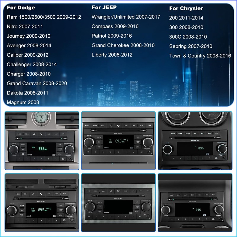 - ✅ 【Vehicle Compatibility】 The car stereo digital media receivers fits for dodge: ram 1500/2500/3500 2009-2012; nitro 2007-2011; journey 2009-2010; avenger 2008-2014; caliber 2009-2012; challenger 2008-2014; charger 2008-2010; grand caravan 2008-2020; dakota 2008-2011; magnum 2008; for jeep: wrangler/unlimited 2007-2017; compass 2009-2016; patriot 2009-2016; grand cherokee 2008-2010; liberty 2008-2012; for chrysler: 200 2011-2014; 300 300c 2008-2010; sebring 2007-2010; town & country 2008-2016