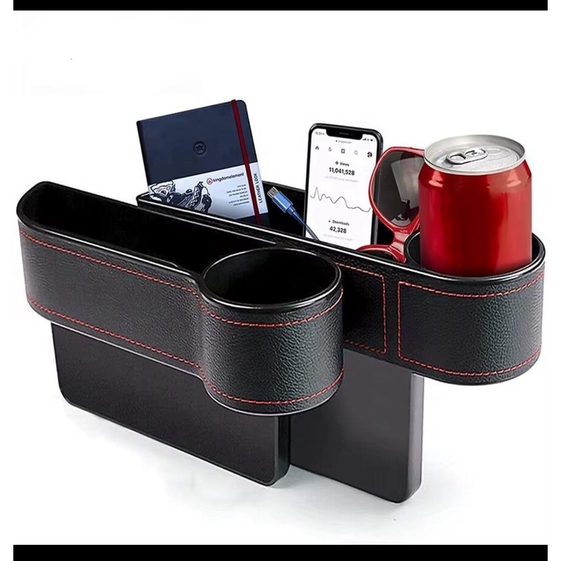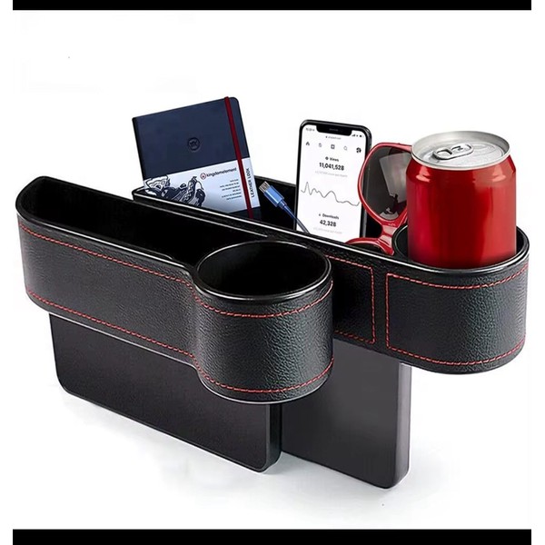 - ✅ Built-in Cup Holder – Features a round compartment for holding drinks, coffee cups, or water bottles. ✅ Stops Items from Falling – Fills the annoying gap between your car seat and console to catch phones, coins, keys, cards, and more.