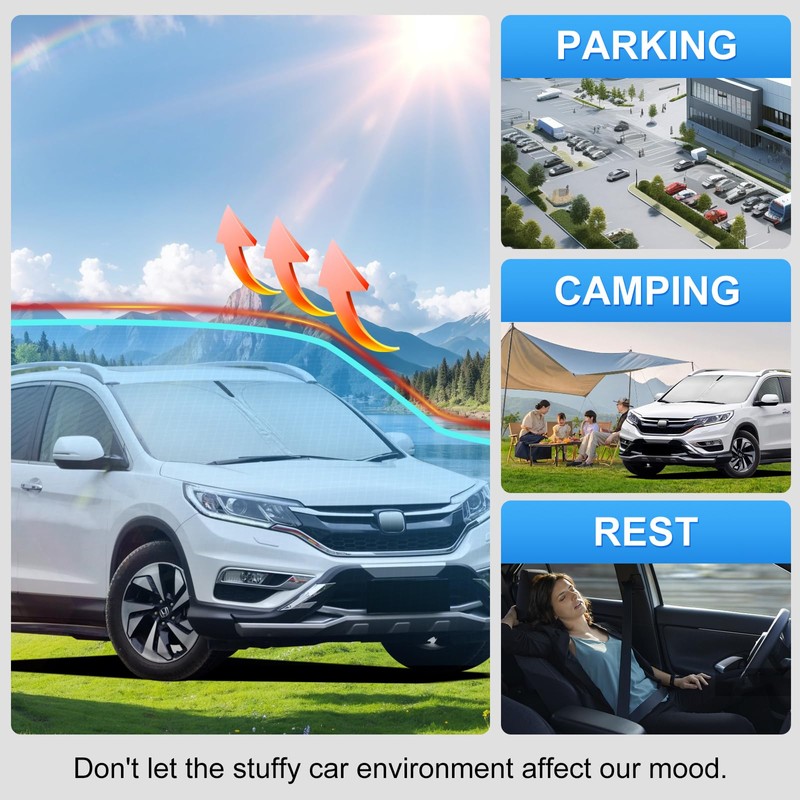 - 【Durability You Can Trust】Crafted from premium 240T polyester,our windshield sunshade is designed to last and resist wear over time,block 99.79% of UVA & 99.95% of UVB And SPF100 & UPF 50+.Keep your car cooler and prevents leather seats from cracking and fading.Great heat shield interior accessories for your car sun visor for car windshield