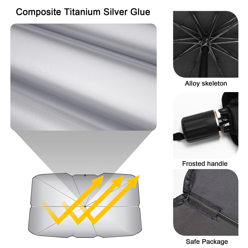- 【Premium Quality & Odorless Material】The car sunshade front windshield umbrella construct from solid 10 bones harden steel skeletons for durable use. With premium titanium silver coating on the surface helps to block out the UV rays, keeping car interior cool and comfortable. The size of this car windscreen sun shade is 57" x 31" (140 x 80cm) for fully cover without light leaking.