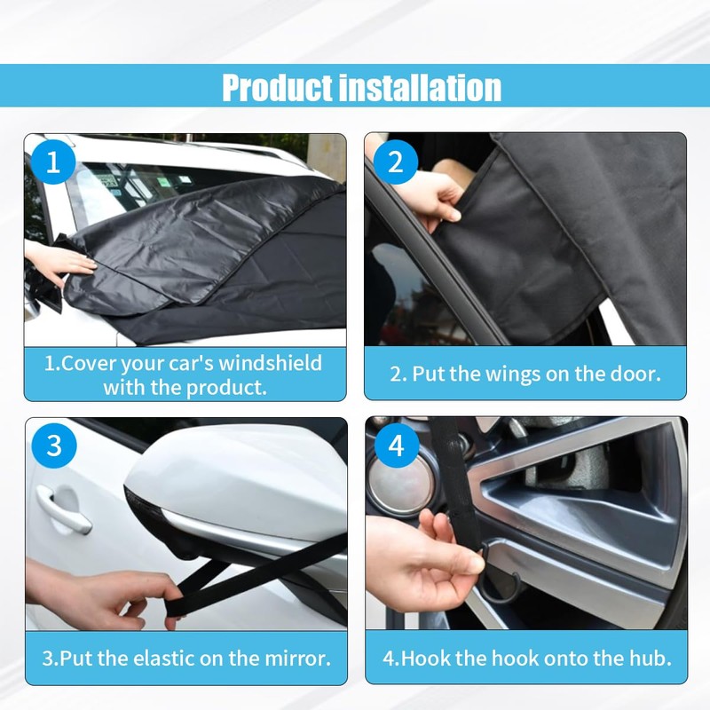 - 【Exclusive Stability】:This automotive windshield snow cover is equipped with 4 elastic straps, 2 loop straps hung on the left and right rearview mirrors, and 2 strap hooks hung on the front wheels. It can be safely installed on the car and will not be blown by the wind. Drop. The two side wings of the windshield can be tucked into the car door, which not only deters thieves but also prevents the snow cover from being blown away by the wind.