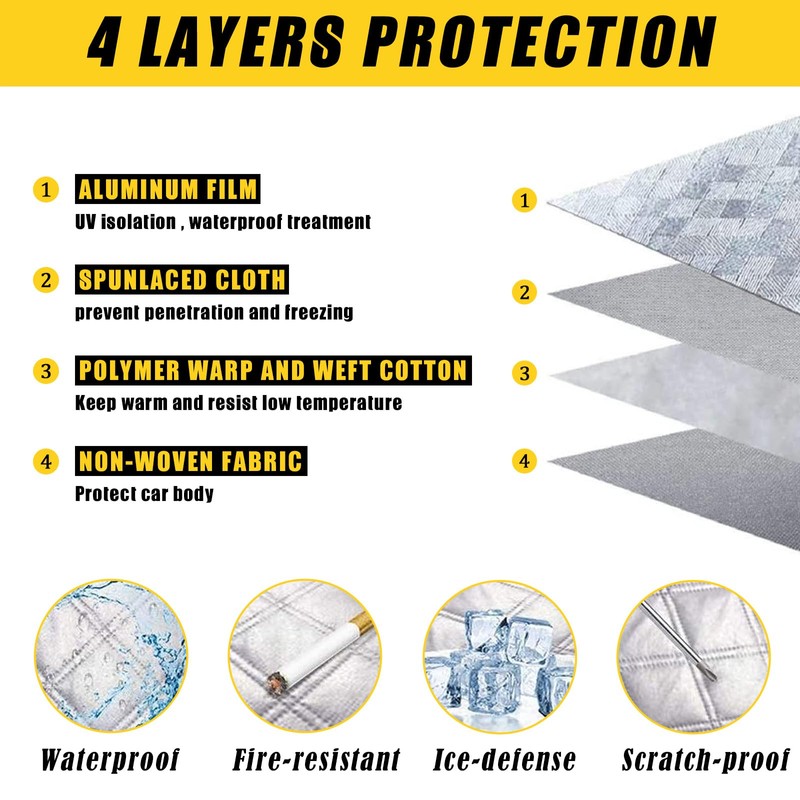 - 【HIGH QUALITY MATERIALS AND DESIGN】: car snow cover 4-layer material made of PEVA Aluminum Foil,spray cotton, spunlace cotton and UV protection barrier. this half windshield snow cover is a premium windproof, weatherproof and waterproof winter car cover. sturdy elastic straps to attach the case to your car and thick, durable plastic hooks to ensure this car protector is securely attached. (Elastic band color is random)