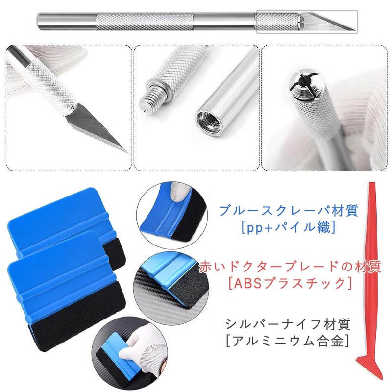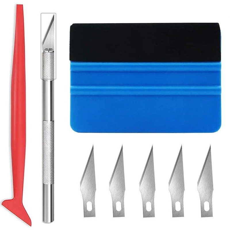 - Set details: Flexible wrap blade: The unique design makes it easy to operate in complex areas such as car gaps and curved surfaces, and can be easily attached to wraps and other film materials. 1 soft wrap-stick squeegee and 2 felt ski cutter: With 5 replacement blades, it is suitable for precision cutting thin materials such as seals, wallpapers, and film, and is easy to replace, ensuring long-lasting cutting precision. Safety Design: All trimming tools and cutters are equipped with a helmet to protect the blade while also protecting the safety of the user