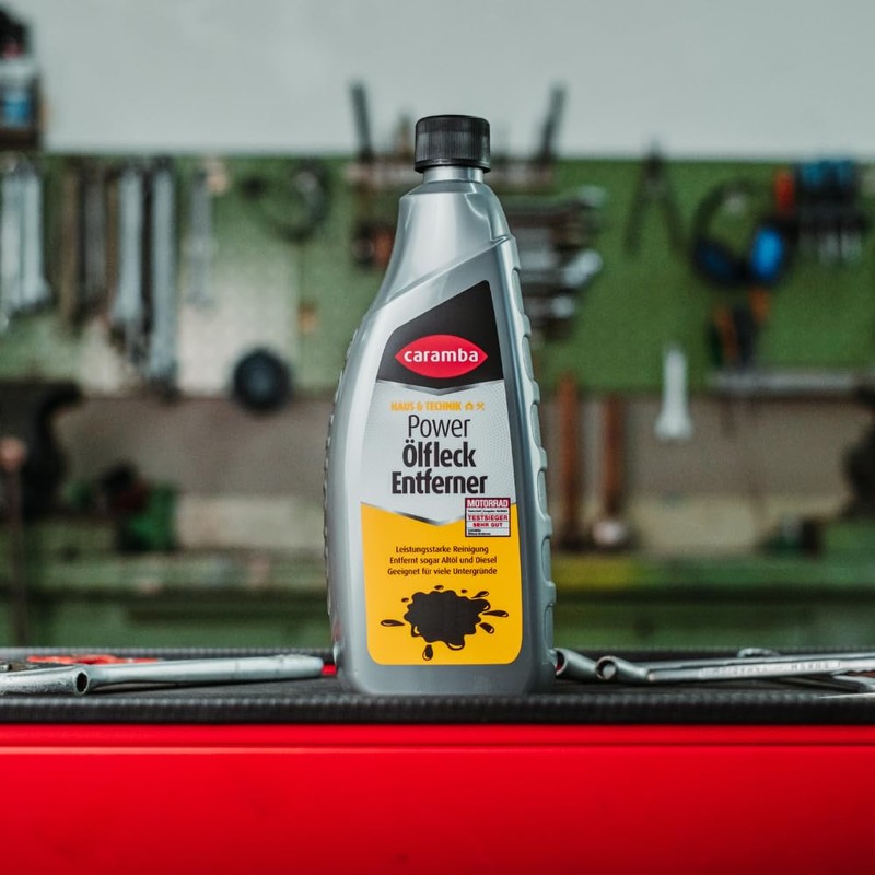 • ANWENDUNG: Überschüssiges Öl von frischen Ölflecken mit Papiertüchern o. ä. aufnehmen. Den Caramba Power Ölfleck Entferner (Art.-Nr. 606811) vor Gebrauch schütteln und auf die verschmutzten Stellen auftragen. Beachte die genauen Anwendungshinweise.