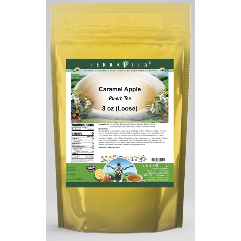 Our Caramel Apple Pu-erh Tea is a terrific flavored Pu-erh tea with Butterscotch Chips, Apples (Dried, Diced, Natural) and Almonds that you can enjoy again and again! You will really enjoy the special Caramel Apple aroma and taste! - Ingredients: Pu-erh tea, Butterscotch Chips, Apples (Dried, Diced, Natural), Almonds and Natural Caramel Apple Flavor. - Hot tea brewing method: Bring freshly drawn cold water to a rolling boil. Place 1 teaspoon of tea for each desired cup into the teapot. Pour the boiling water into the pot, cover and let steep for 2-4 minutes. Strain and pour into your cup; add milk and natural sweeteners to taste. - Iced tea brewing method: (to make 1 liter/quart): Place 5 teaspoons of tea into a teapot or heat resistant pitcher. Pour 1 1/4 cups of freshly boiled water over the tea itself. Steep for 5 minutes. Fill a serving pitcher with 1/4 cold water. Strain and pour the tea into the serving pitcher Add ice and top-up with cold water. Sweeten and garnish to taste. - TerraVita is an exclusive line of premium-quality, natural source products that use only the finest, purest and most potent ingredients found around the world. TerraVita is hallmarked by the highest possible standards of purity, potency, stability and freshness. All of our products are prepared with the highest elements of quality control, from raw materials through the entire manufacturing process, up to and including the moment that the bottles or bags are sealed for freshness and shipped out to you. Our highest possible standards are certified by independent laboratories and backed by our personal guarantee. - TerraVita exists to meet and ensure your family's health and wellness without the harmful effects or chemicals and prescription medications. We strive to make all of our product