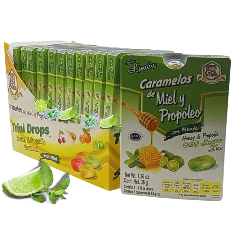 Caramelos de Miel y Propóleo Sabor Limón con Menta (Honey & Propolis Caramels Lime w/Mint Flavor) - Display Tray with 12 Packs (9 Candies Each) - Traditional Tía Trini Brand
