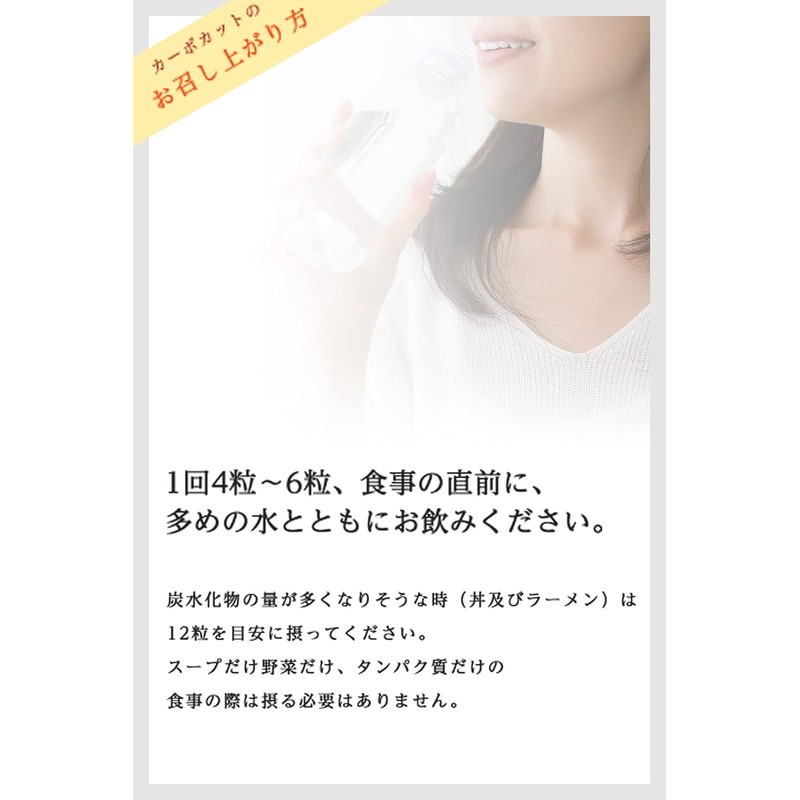 ■How to use: Take with a sufficient amount of water before a meal. Take about 12 tablets if you eat a lot of carbohydrates (such as a rice bowl or noodle). You do not need to take any if you only eat soup, vegetables, or protein food.
