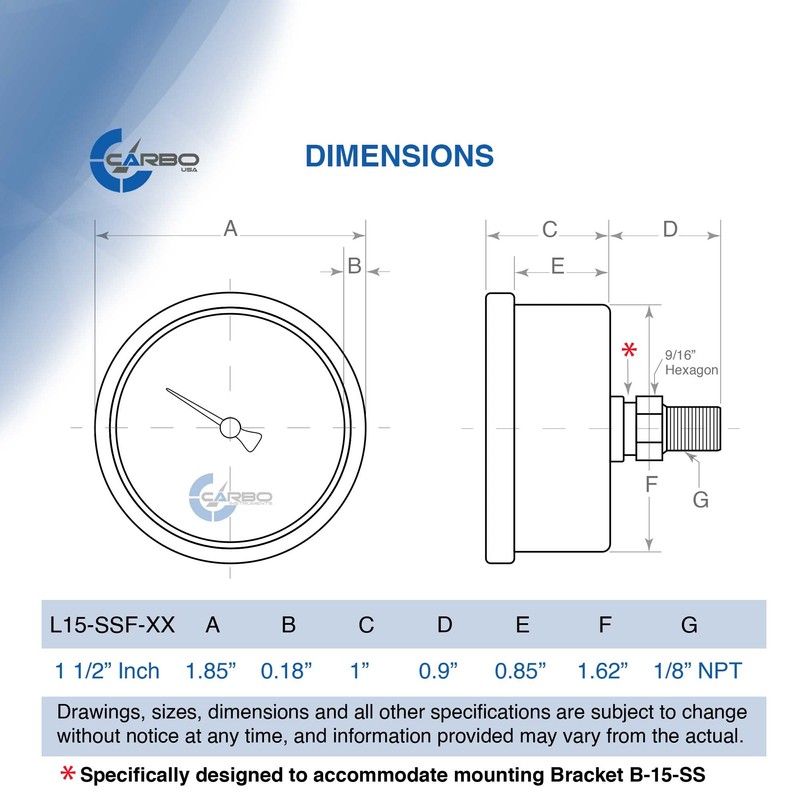 CARBO INSTRUMENTS Carbo Instruts 1-1/2" Fuel Pressure Gauge, Stainless Steel Case 304, Chrome Plated Brass Connection, Glycerin Filled, 0-15 Psi, Accuracy 3-2-3%, Back Mount 1/8" 15 Psi