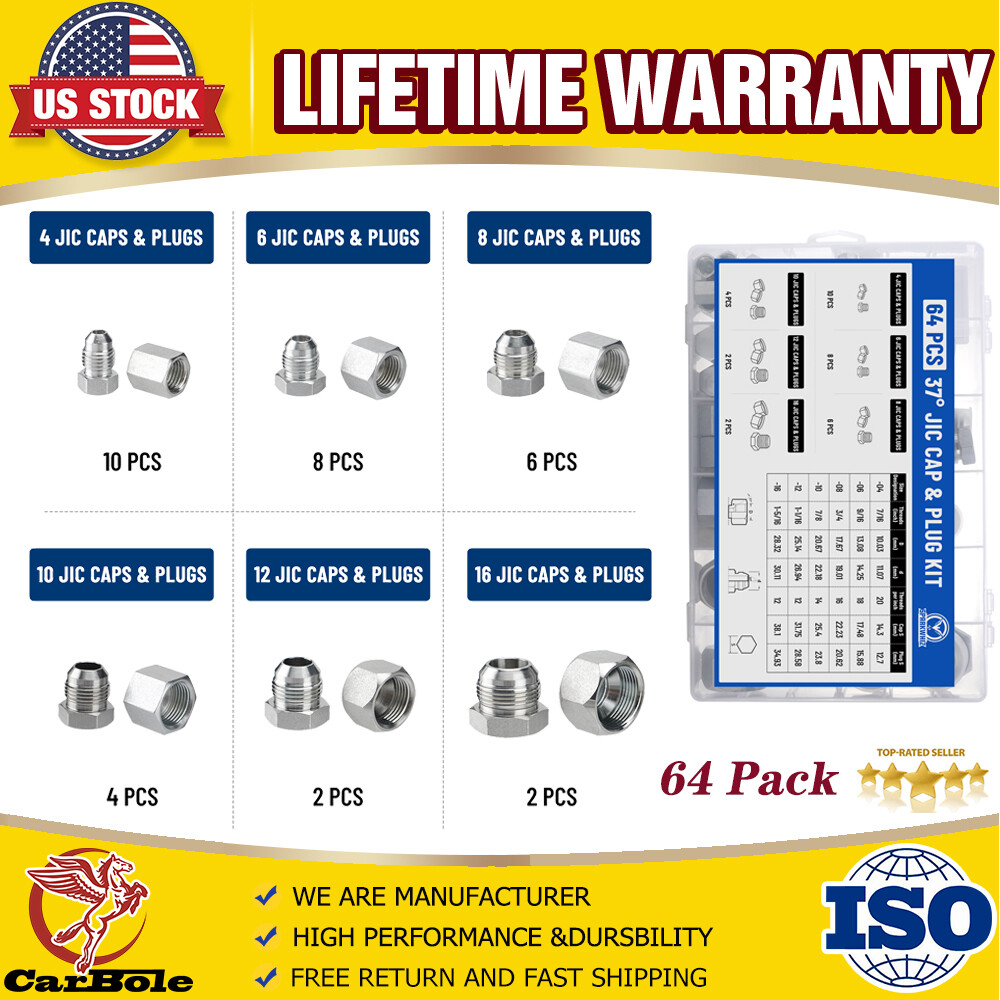 Product Description: 64 FITTINGS: 64 PCS hydraulic JIC cap & plug fittings kit,AN assortment hydraulic fitting set,also known as "AN" 37 degree flare JIC caps and plugs. The JIC 37° flare thread cap & plug can be easily installation to seal hydraulic hoses, tubes, and pipes