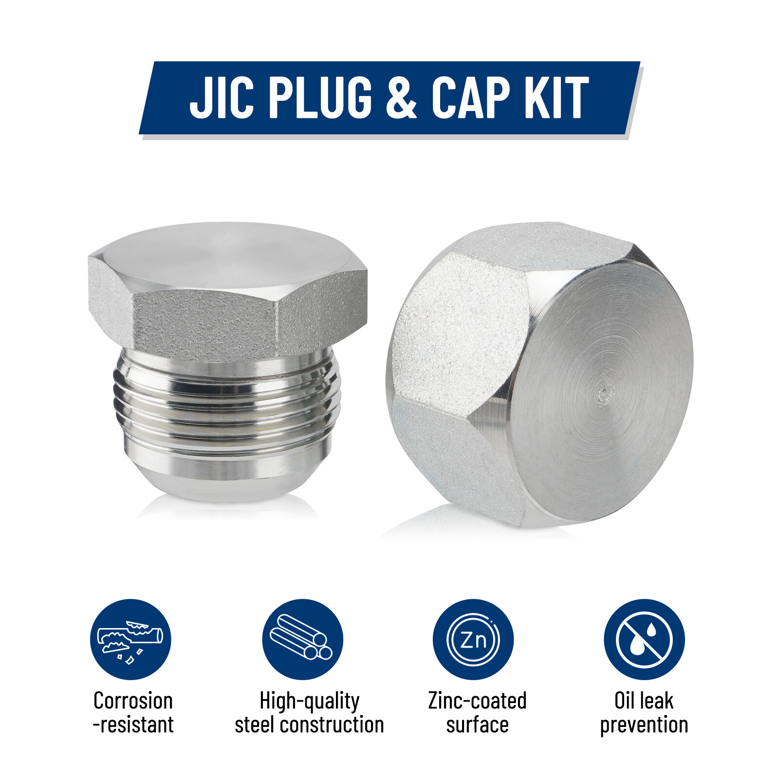 A must have for hydraulic lines: hydraulic JIC plug and cap cap kit works great for hydraulic repairs.The JIC cap and plug are sealed quickly keep hydraulics lines from fluid leaking when remove fluids hydraulic application/machinery work/ truck/chemical processing systems
