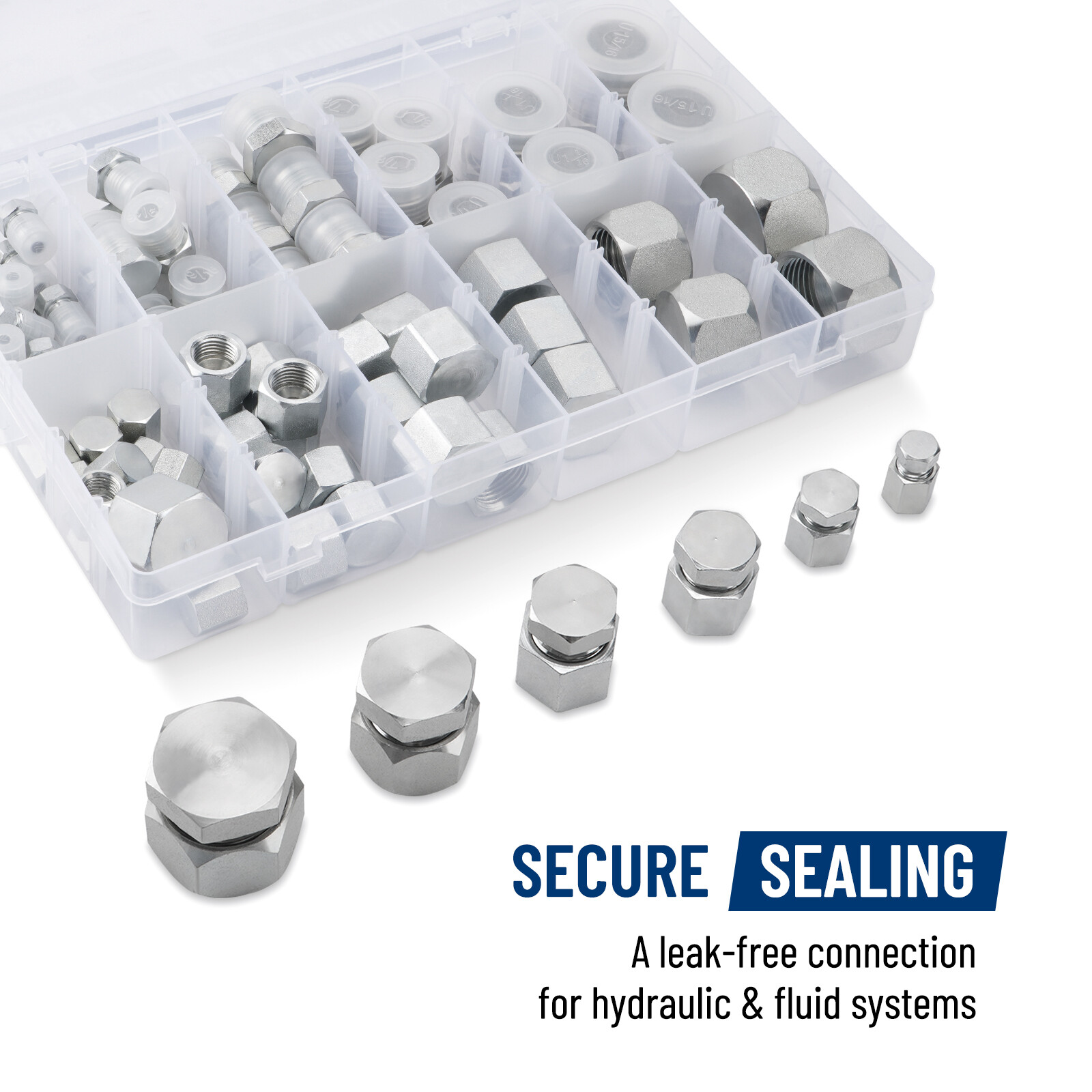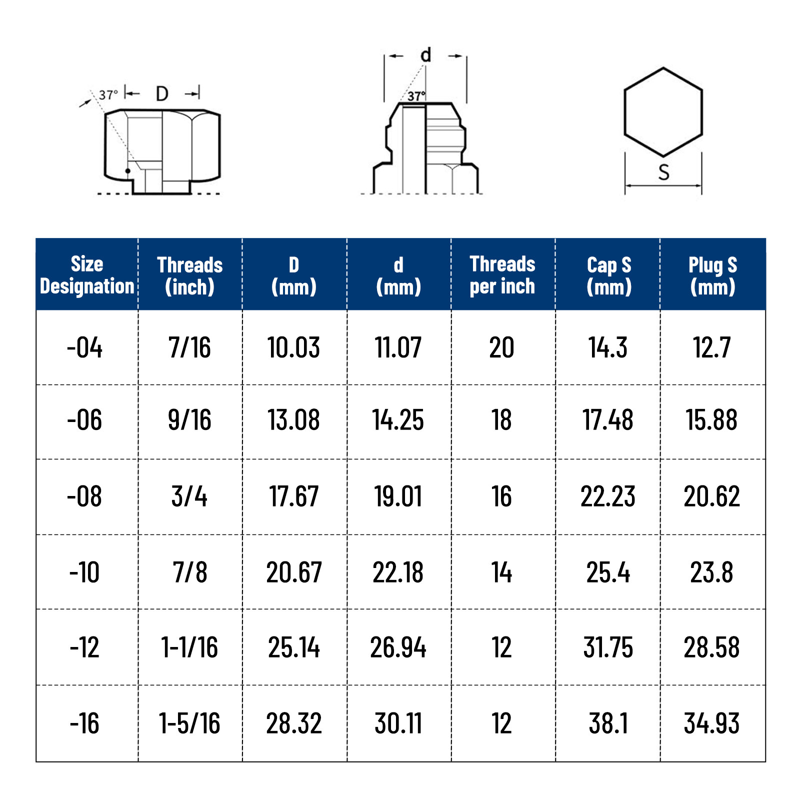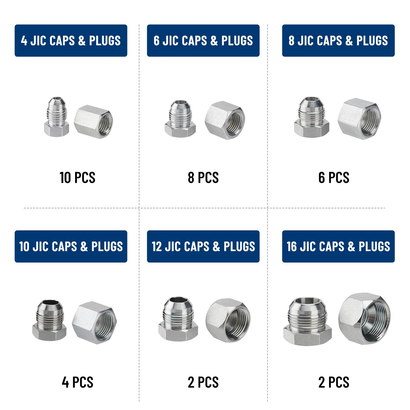 Package Includes: #4 (7/16-20) JIC caps&plugs---each 10PCS| #6 (9/16-18)caps&plugs ---each 8PCS| #8 (3/4-16)caps&plugs---each 6PCS| #10 (7/8-14)caps&plugs---each 4PCS| #12 (1 1/16-12) caps&plugs---each 2PCS| #16 (1 5/16-12) caps&plugs---each 2PCS
