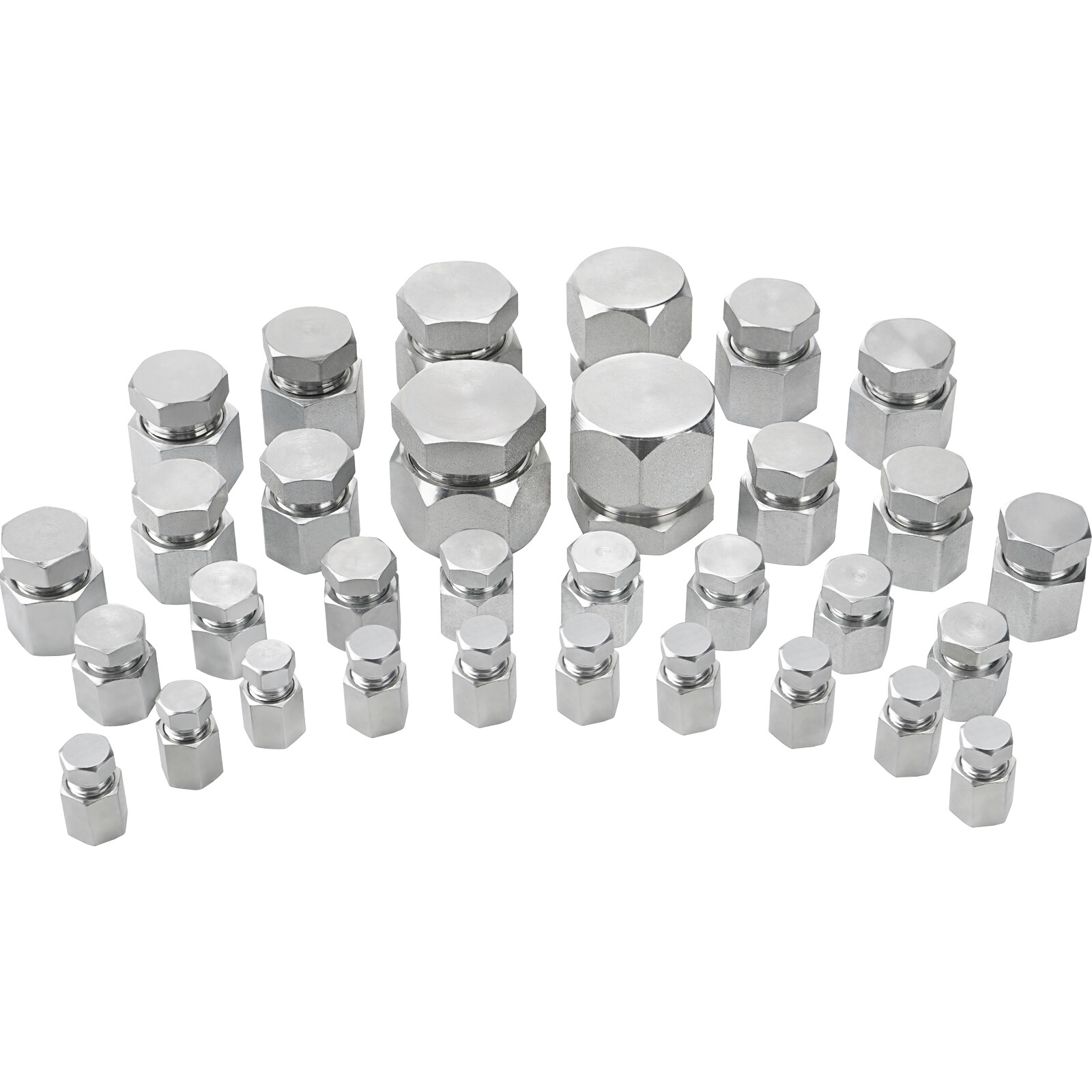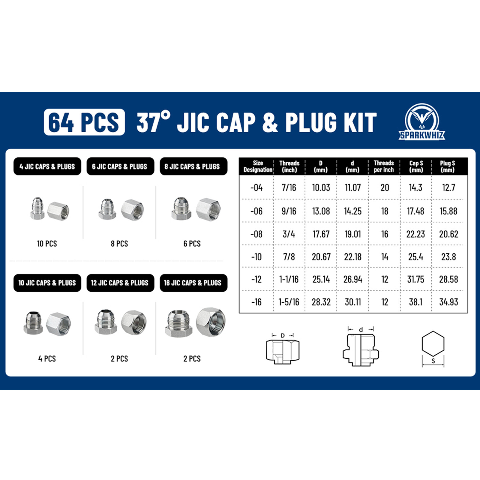 64 FITTINGS: 64 PCS hydraulic JIC cap & plug fittings kit,AN assortment hydraulic fitting set,also known as "AN" 37 degree flare JIC caps and plugs. The JIC 37° flare thread cap & plug can be easily installation to seal hydraulic hoses, tubes, and pipes