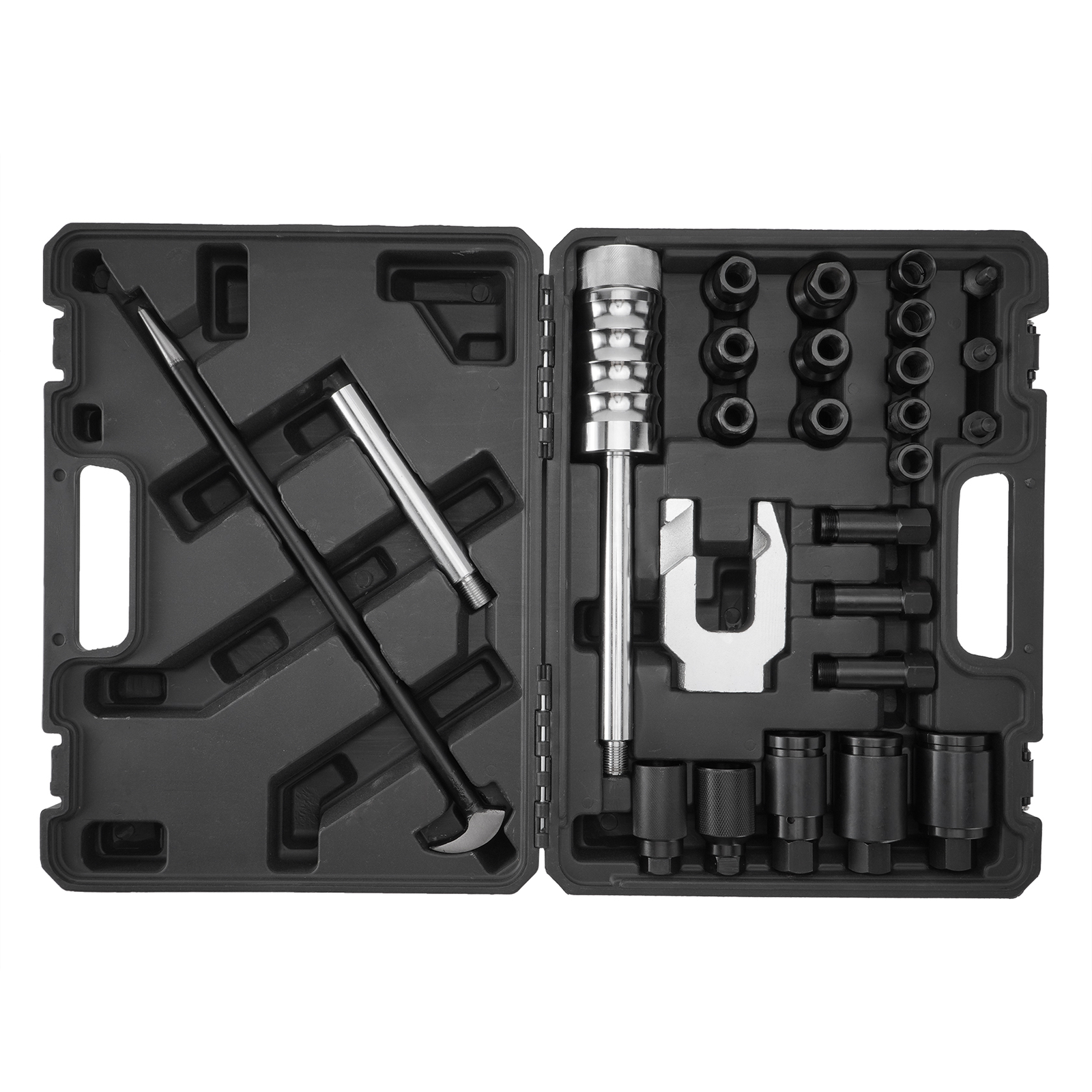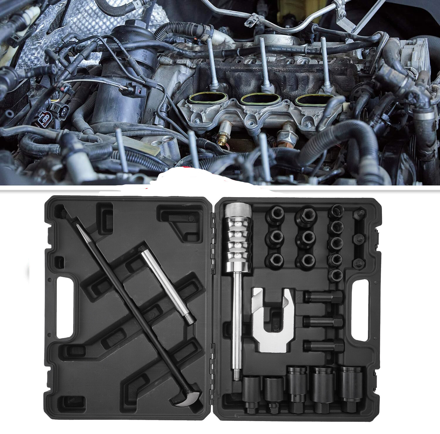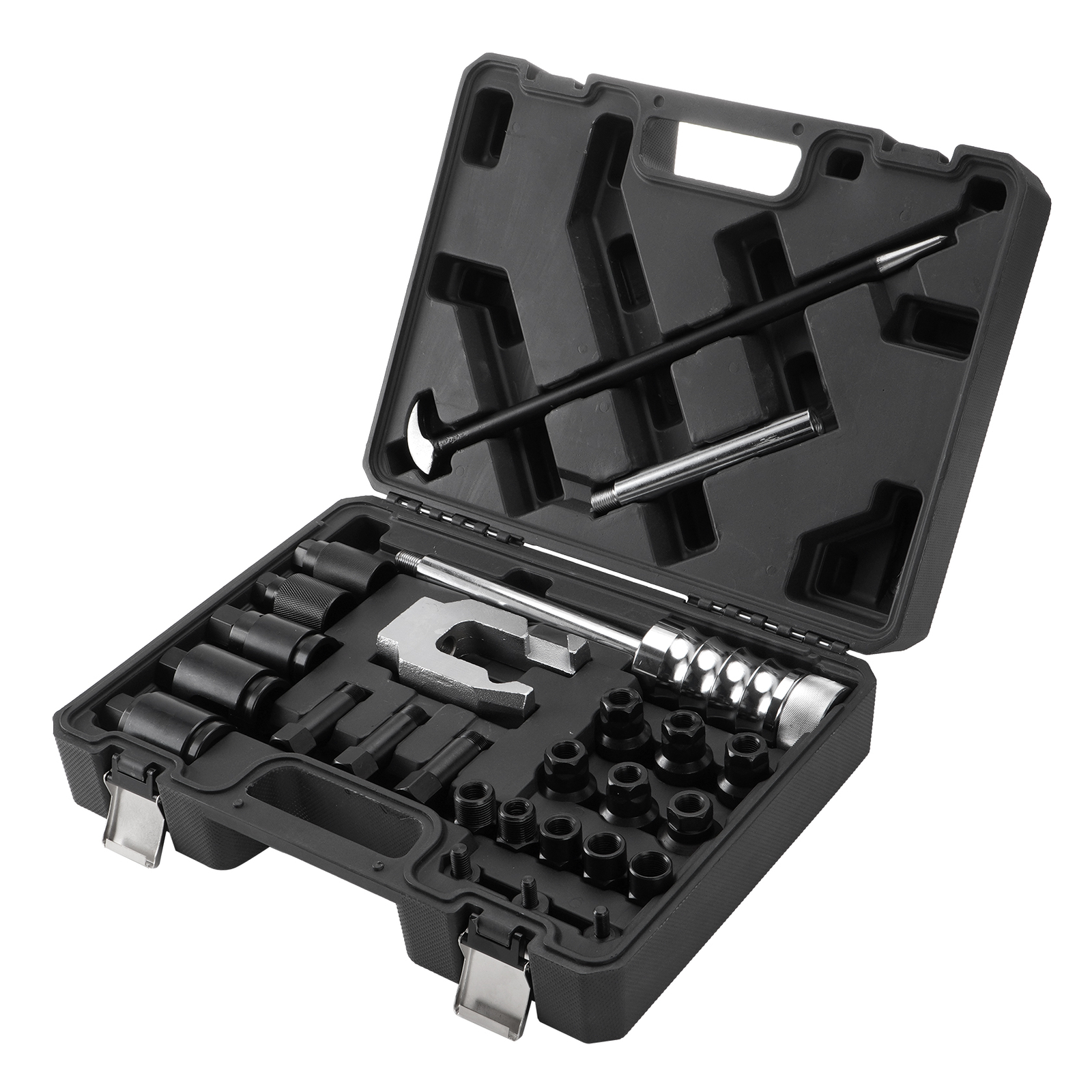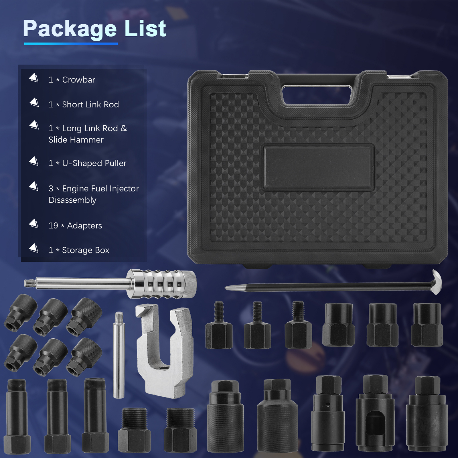 Includes also the following components: 3 different slide hammers: 1.6 kg, 160 mm length 2 pulling claws with fork opening: 13.7 x 18 mm, 105 mm length 5 slotted 6-pt 1/2" sockets, 100 mm length sizes 25 - 27 - 28 - 29 - 30 mm injector extractor, sleeve design, with shells outer diameter 35 mm,internal diameter 29 mm,M17 x 1.0 spindle pulling adapter with external thread M27 x 1.0 (3pcs) and M25 x 1.0 pulling adapter with internal thread M27 x 1.0 (3pcs) sliding hammer adapter for inner, outer and claw extractor