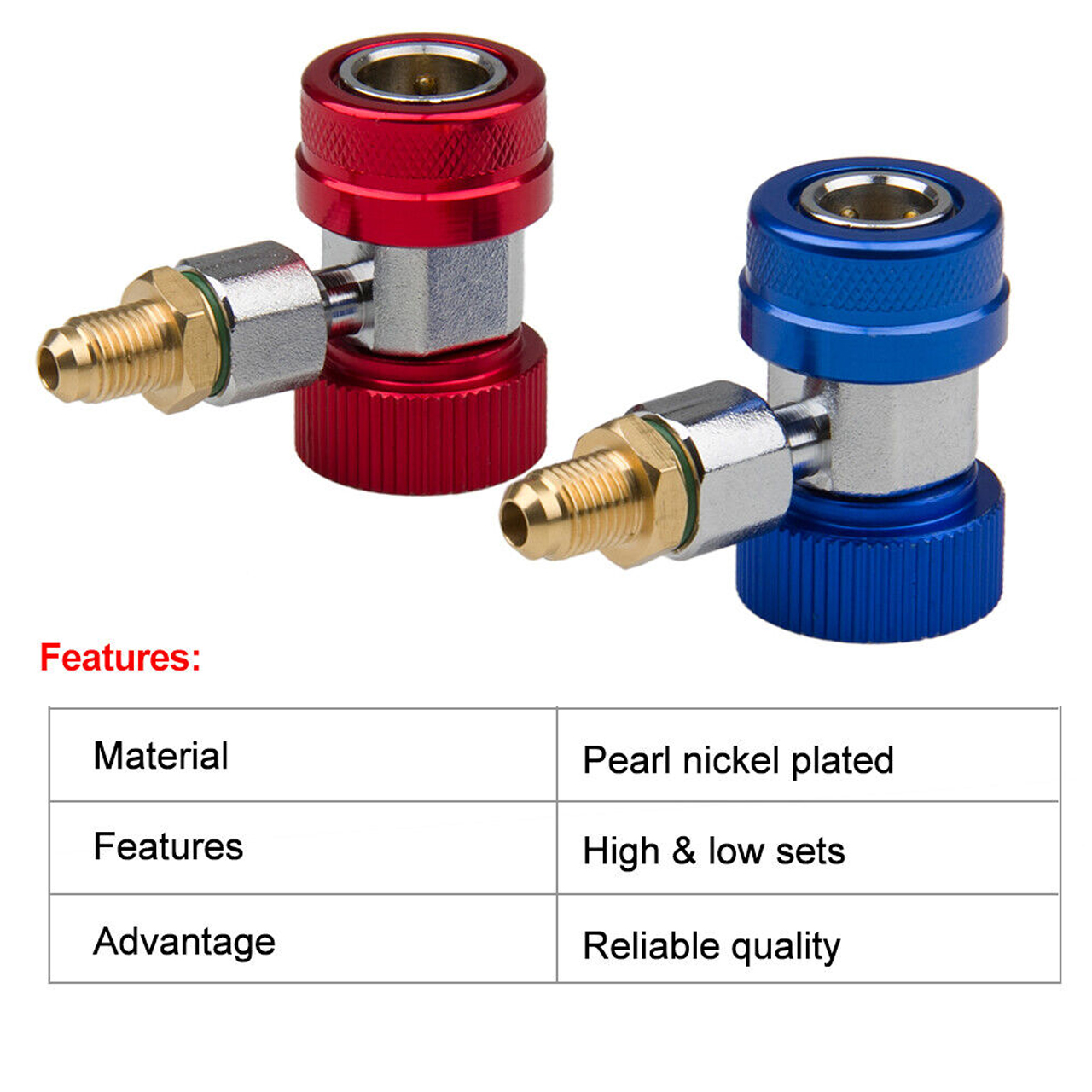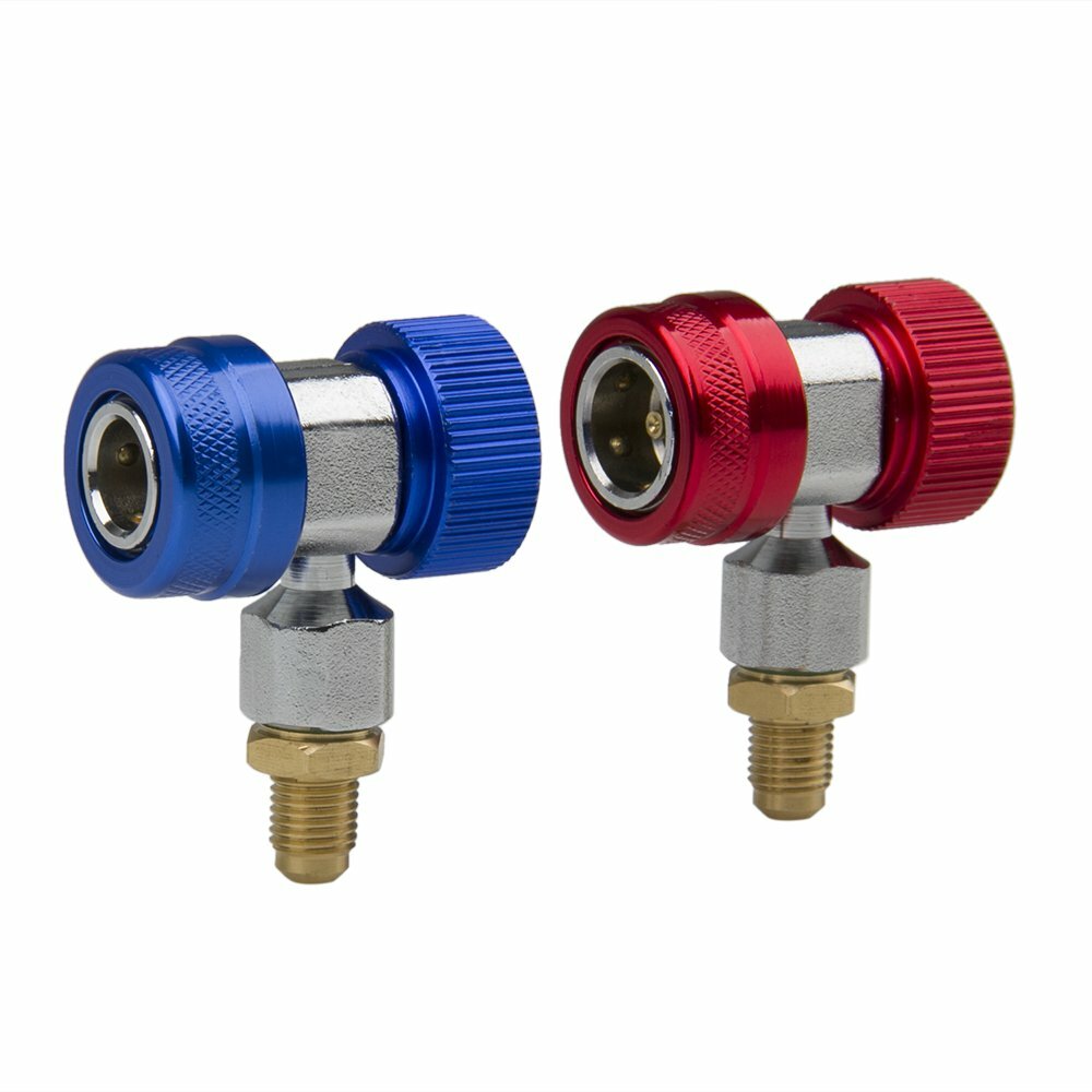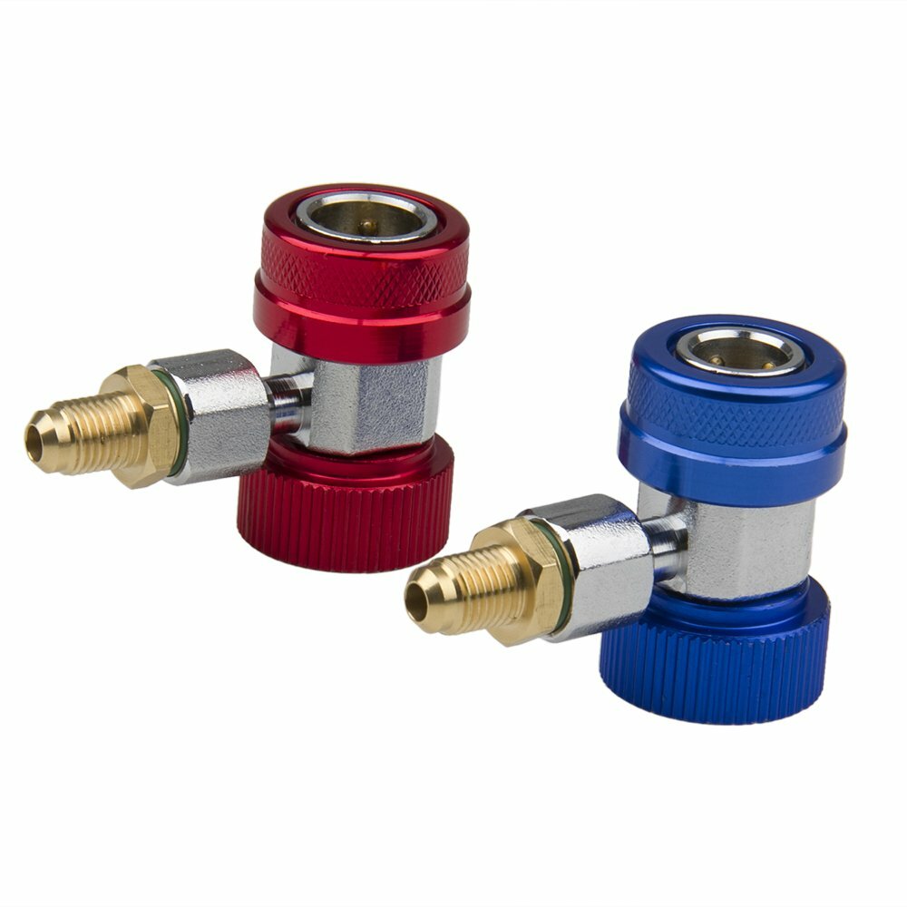 Features: Set of 2 Color Coded 90 Degrees Quick Connectors Specifications: Package Includes: 2x Adjustable A/C Quick Couplers (High & Low Side)