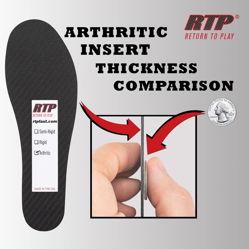 - RTP Carbon Fiber Inserts are MADE IN USA. A TEXTURED surface on BOTH sides prevents slipping in shoe, Carbon fiber is used because of its light weight, stiffness, durability, allowing a very thin insert to stiffen the shoe protecting the foot. Not all injuries, pain levels, activity levels, or shoes are the same. 3 levels of stiffness for foot injuries: SEMI-RIGID stiff but flexible, RIGID stiffer but some flex, ARTHRITIC very stiff minimal flex. IF IN DOUBT GO DOWN TO MOST FLEXIBLE INSERT