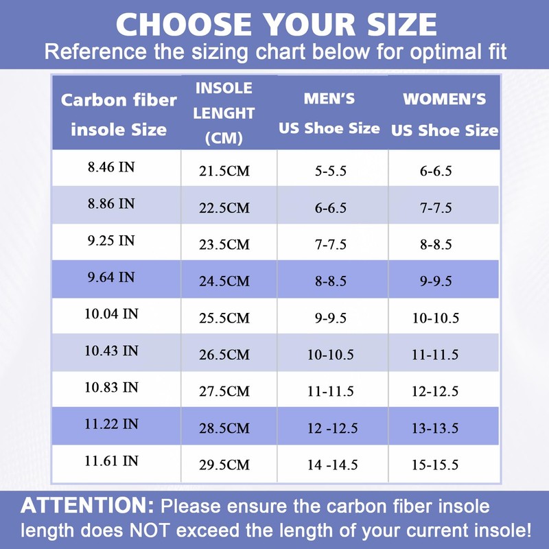 - 3.✅✅✅【HOW TO USE THE CARBON FIBER INSOLE】Installation: Take out your the origin insole of your shoes, Insert the carbon fiber insole and push it in place, And then put the origin insole on the carbon fiber insole . The size of carbon insole should be 1 size smaller than the size of origin removable insole. You could choose your size according to the chart. Please ensure the carbon fiber insole must shorter than your foot, and to fit the carbon fiber insole in the shoe. If in between sizes or half sizes round down to smaller sizes.