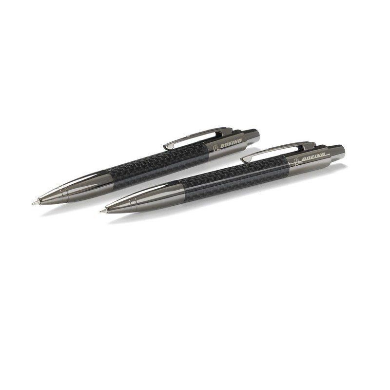 While Boeing is famous the world over for its selection of the highest caliber materials for the construction of its aircraft, this Carbon Fiber Pen and Pencil Set shows the aerospace giant doesn't skimp on small-scale items either. In place of second-rate components, Boeing uses steel, brass, and carbon fiber in this ballpoint pen and mechanical pencil. Both items feature sturdy clips for convenient, close-at-hand storage and bear the Boeing Company logo near their tops. As further evidence of their quality, the set comes in a beautiful black gift box with magnetic closure. Makes an excellent gift item. The pinnacle of pen & pencil sets from the planet's premium plane producer.