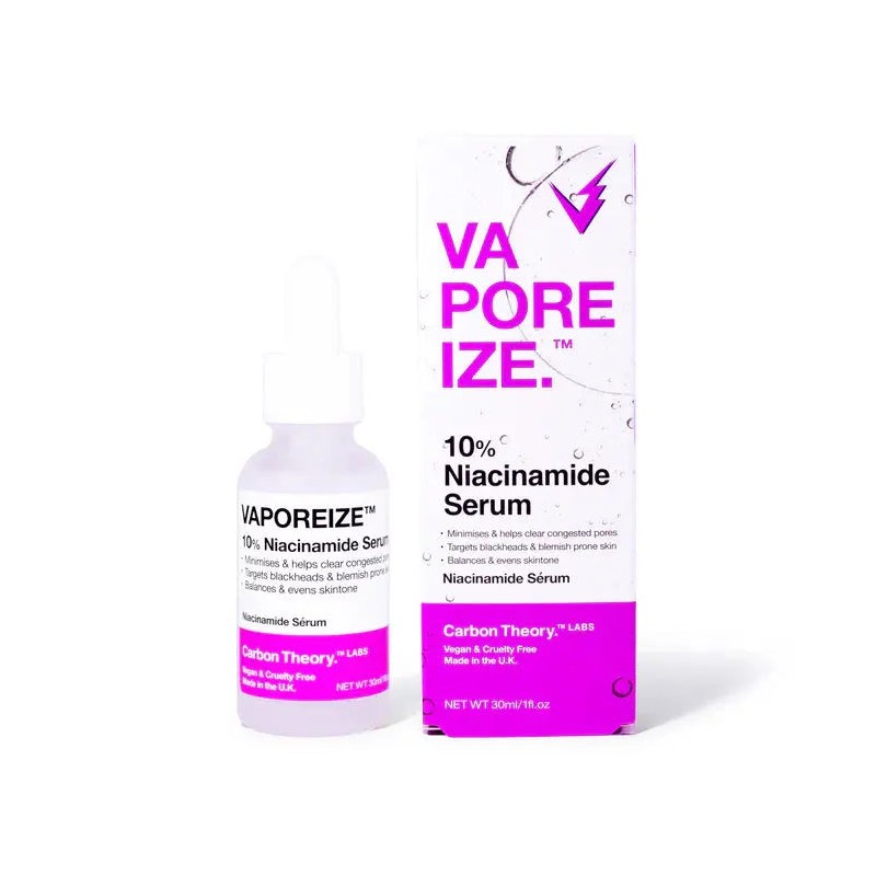 The Carbon Theory VaPOREize 10% Niacinamide Serum is your daily boost for a clear and balanced complexion. With 10% niacinamide and 1% zinc, this serum helps to clear clogged pores, reduce blackheads, and even out skin tone – without overwhelming your skin. Perfect for daily use, even for sensitive or combination skin.
