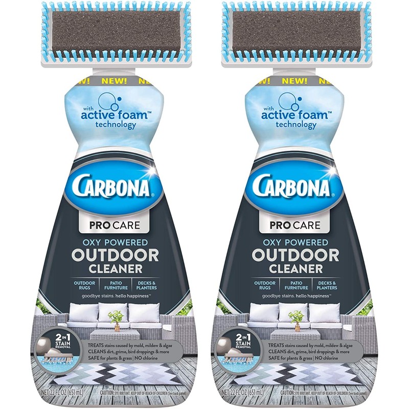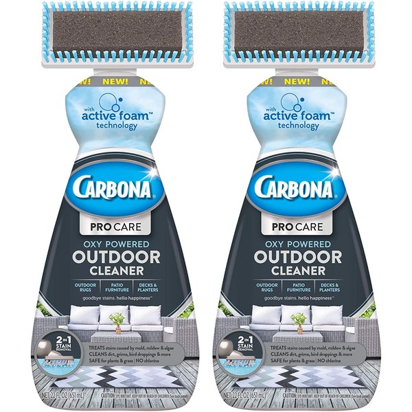 - OUTDOOR STAIN REMOVER: Carbona Pro Care Outdoor Cleaner combines an oxy powered formula with active foam technology, with the convenience of a built-in brush applicator, to effectively spot clean a variety of outdoor surfaces and living spaces. The formula is safe for plants/grass and safe to use around pets.