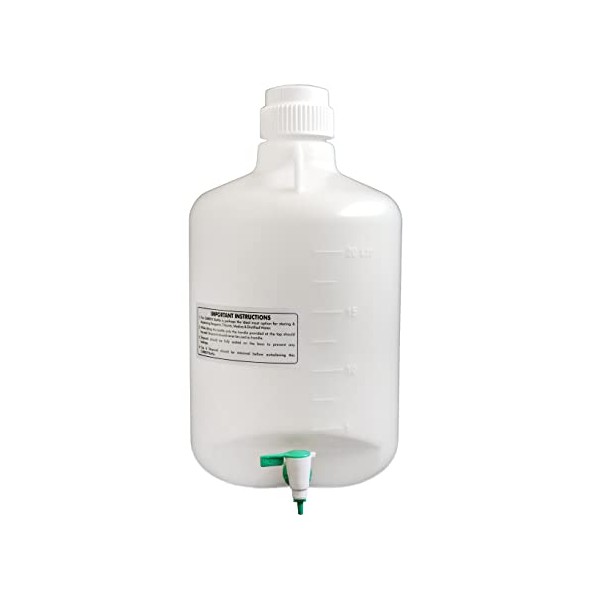 Carboy Bottle with Stopcock, 20 Liter Capacity, White Premium Polypropylene with 2 Handles - Eisco Labs