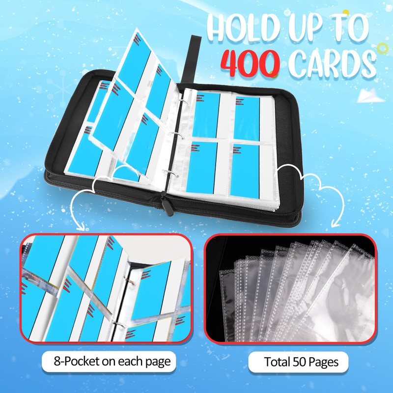 • đŸ”„ă€Large Storage Capacity】Size: 7*2*9.5 inches. The card binders contains 50 card sleeve pages and can hold 400 cards. The size of each pocket of the card page is 2.8*3.9 inches, which is a collectible trading card album. The card binder provides enough space to organize all your cards, which is perfect for storing and displaying cards