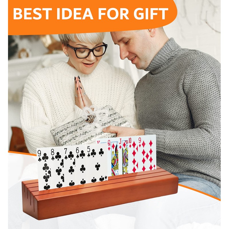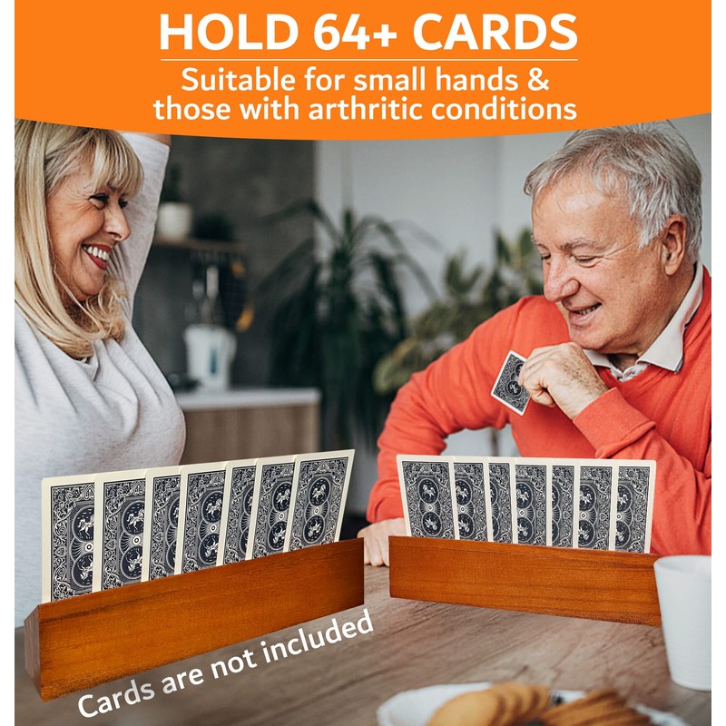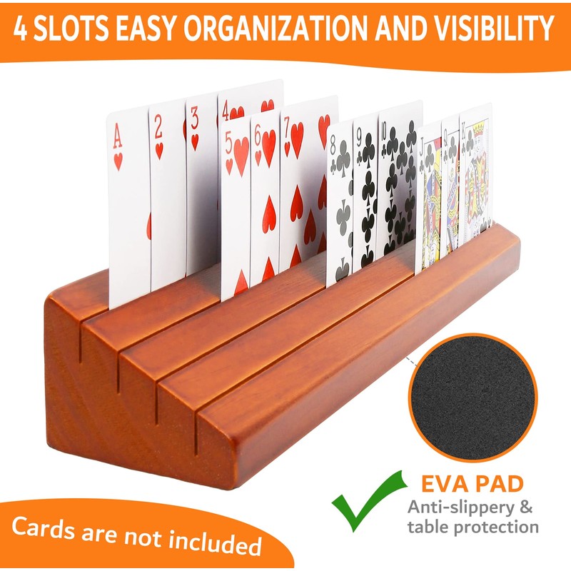 - Wood playing cards holders set of 4. These wood card racks are made of solid wood, well-constructed and durable, smooth surface will not scratch cards, no-slip EVA felt the grip on the bottom to prevent sliding and protect the table. Playing cards are not included. The playing card rack has 4 slots in ascending height for easy organization and visibility, easy to see each row of cards. The groove that holds the cards is wide enough that you can overlap cards.
