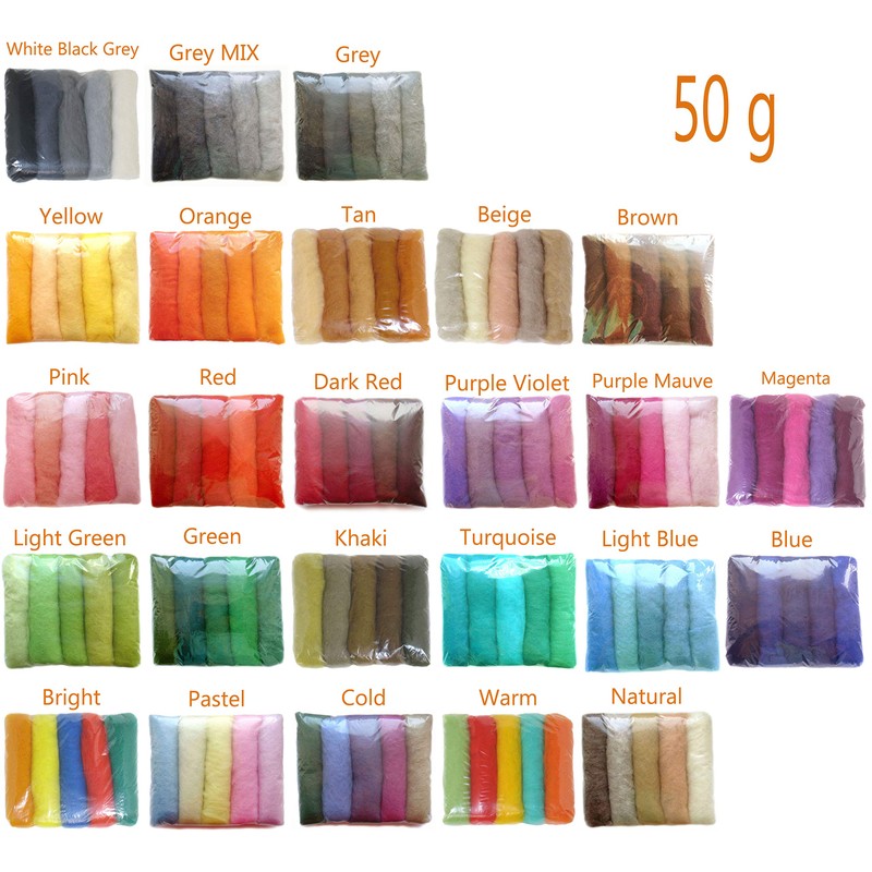 - We have more than 90 different colours: white, black, different shades of gray, yellow, orange, beige, brown, pink, red, green, blue and purple. You can choose individual shades or a series of 50g, 100g, 200 shades (mix) (see our other offers).