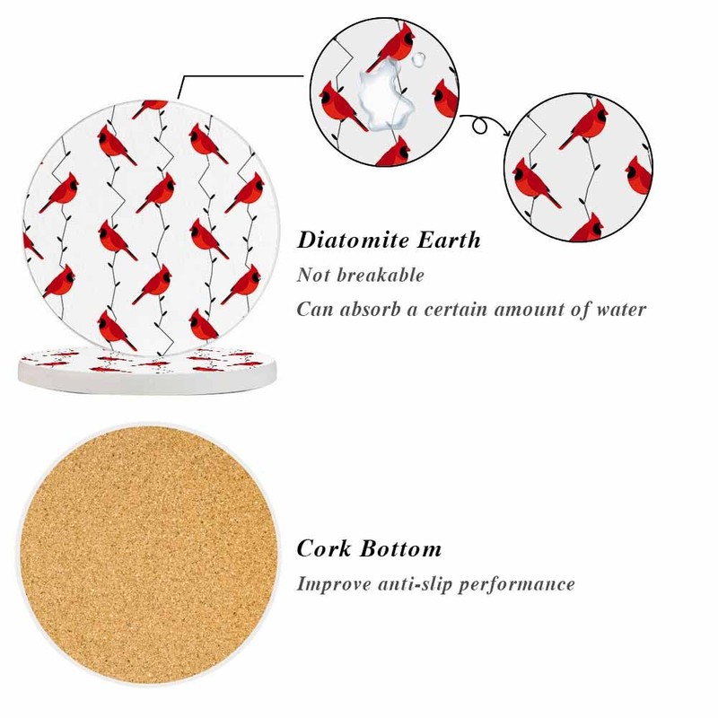 Cardinal Bird Coasters Red Birds on Branches Absorbent Drink Coaster Set of 2 Unique Beer Beverage Coasters for Coffee Table Cup Bar Coasters Cute Cork Ceramic Coasters