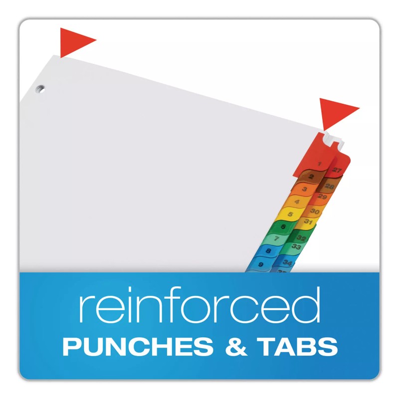 Instantly create custom index sets by printing onto the two column Table of Content sheets. Matching, preprinted tabs on the divider sheets can be used in either vertical or landscape formats. Multicolored tab sets have coordinating multicolor Table of Content sheets. Easy to use, no-cost templates in your favorite software are available online; details on packaging. Tabs and ring edges are reinforced to withstand heavy use. Laser and inkjet compatible. Three hole-punched. Tab Style: 52-Tab; Tab Color(s): Multicolor; Index Divider Size: 11 x 8 1/2; Form Quantity: 1.