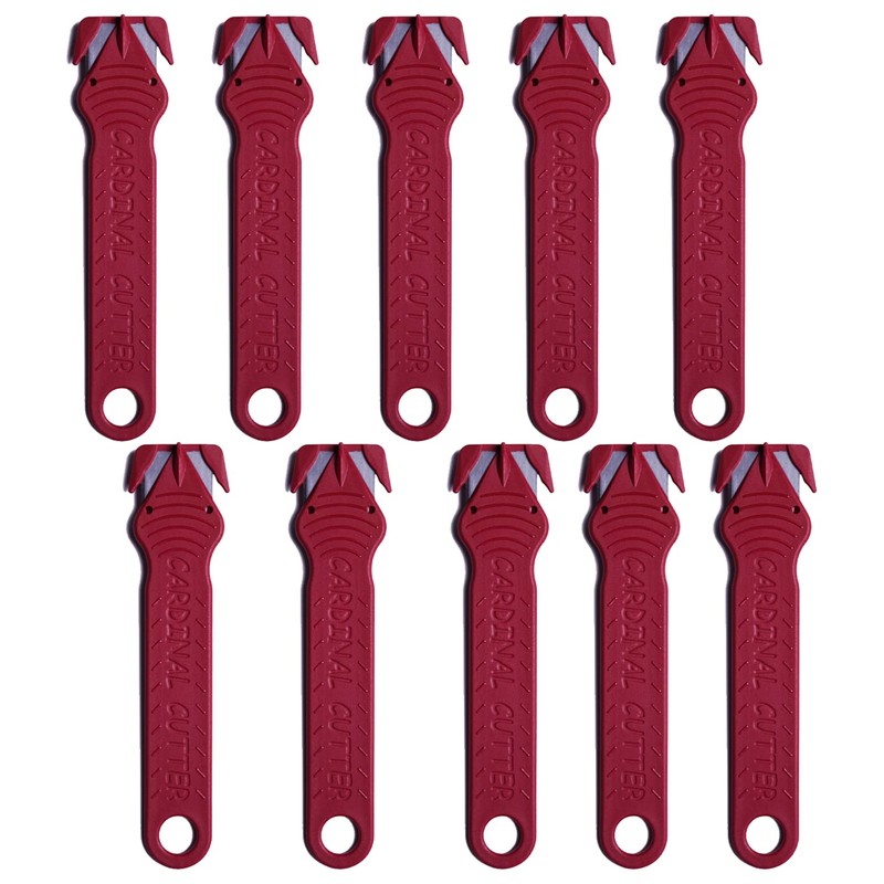 Cardinal Safety Box Cutter with Concealed Stainless Steel Blade, Package Opener Plastic Cutter for Box, Carton, Shrink Wrap, Plastic Straps (Red,Pack of 10)