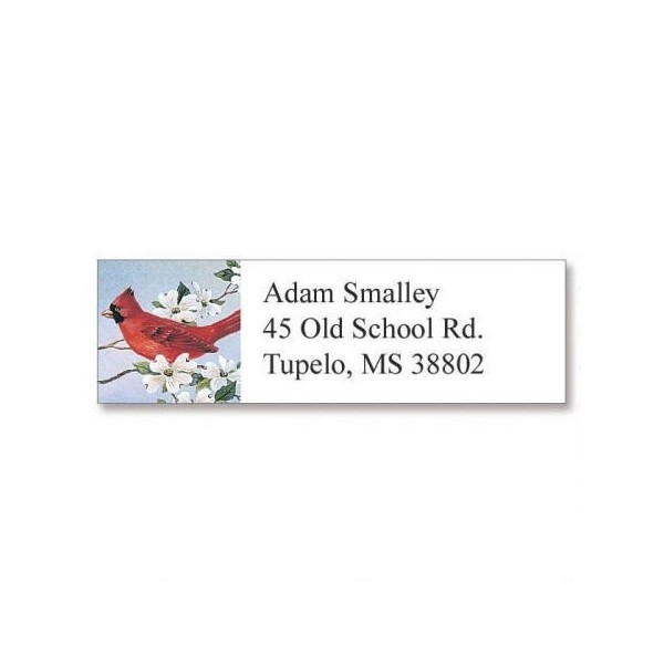 Gorgeous iridescent cardinal provides a dramatic accompaniment to your mail as it wings its way to its destination! 240 address labels per set, each measuring approximately 2" x 5/8". Specify block or script and 4 lines of personalization, up to 26 characters.