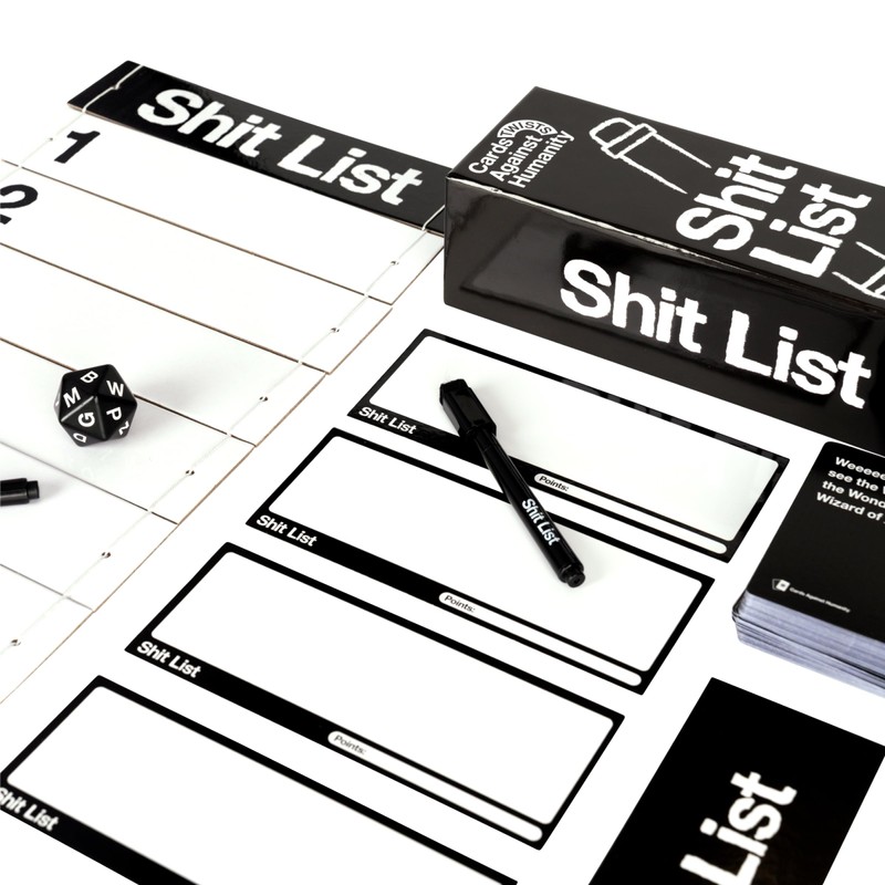 - Includes 80 all-new Cards Against Humanity black cards, a massive Shit List board, 12 sets of individual whiteboards and markers, and a big black D20.