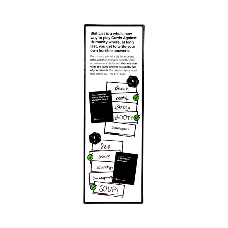 Cards Against Humanity: Shit List is a new party game where, at long last, YOU get to write your own answers to Cards Against Humanity black cards. You draw a black card, and then everyone secretly writes an answer starting with the same randomly-picked letter. Your mission: write the same thing as exactly ONE of your friends. Match with more? Too obvious. Match with nobody? Too weird. Hit the sweet spot, and your answer gets added to... THE SHIT LIST! One of our new Cards Against Humanity Twists: All-new party games to play with the CAH cards you already have. Don't have any other CAH stuff? No problem. You can play this box all by itself.