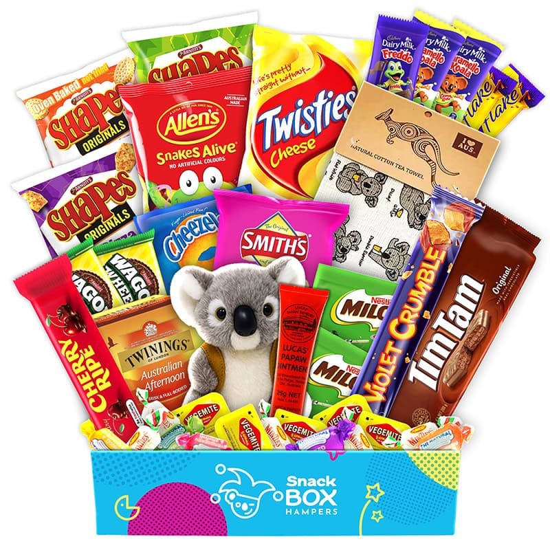 Looking for the perfect gift for an Aussie living overseas? Then look no further, grab a Koala Hugs Australian Faves Snack Box. Perfect for a homesick Australian, this hamper is great for birthdays, Christmas, and other special occasions. Filled with bestselling classic Aussie snacks topped off with a cute plush Koala, this hamper is sure to warm their heart and remind them of home.
