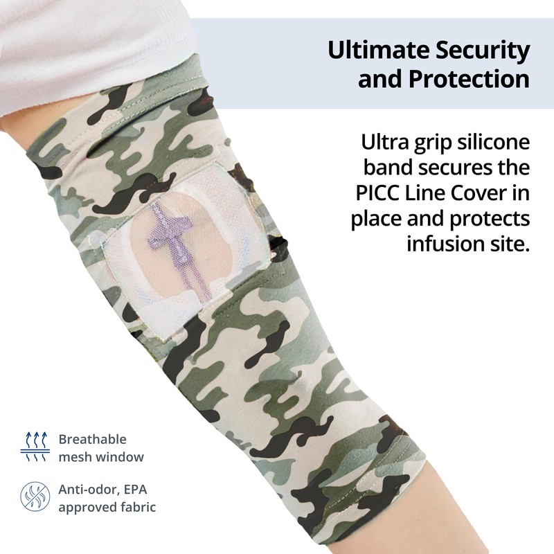 Care+Wear Long PICC Line Cover – Ultra-Grip PICC Line Sleeve for Upper or Lower Arm with Mesh Viewing Window, Provides Improved Comfort and Security for PICC Line Coverage (Large, Camo)