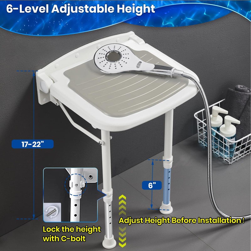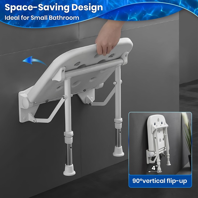 Caredear Wall Mounted Shower Seats w/PU Cushion (FSÄ/HSÄ Eligible) Support 550lbs, Adjustable Height Folding Shower Chair Wall Mounted for Elderly-Adults-Pregnants-Seniors-Disabled